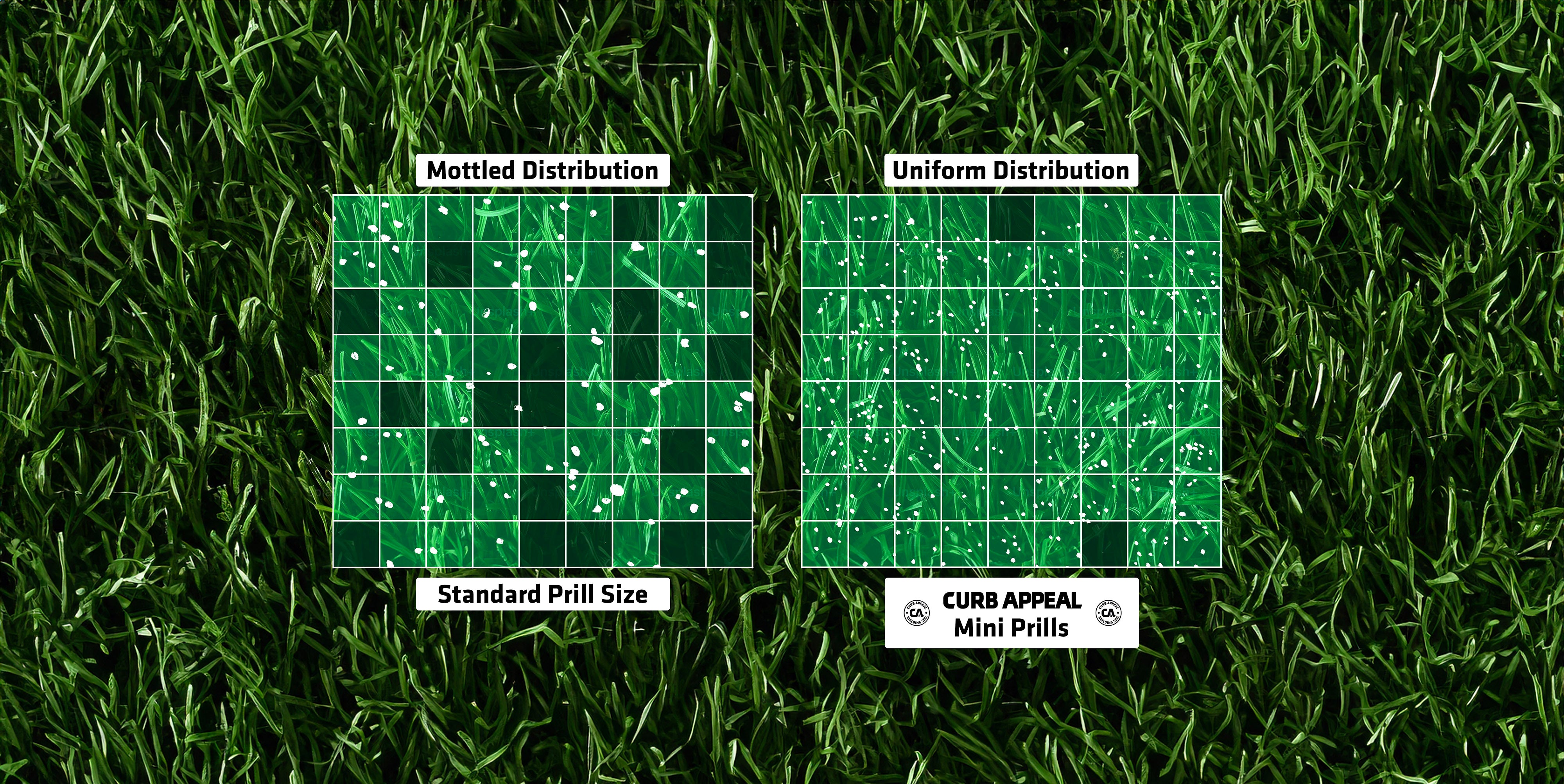 In the image below, the distribution of standard prill size is on the left and a mini prill size is on the right. The enhanced distribution uniformity of a mini prill size versus a standard prill size is quite apparent. Nutrient distribution is greatly enhanced, so the likelihood of a mottled appearance is significantly reduced. When using mini SGN prills, a more even and consistent turfgrass growth response can be expected.